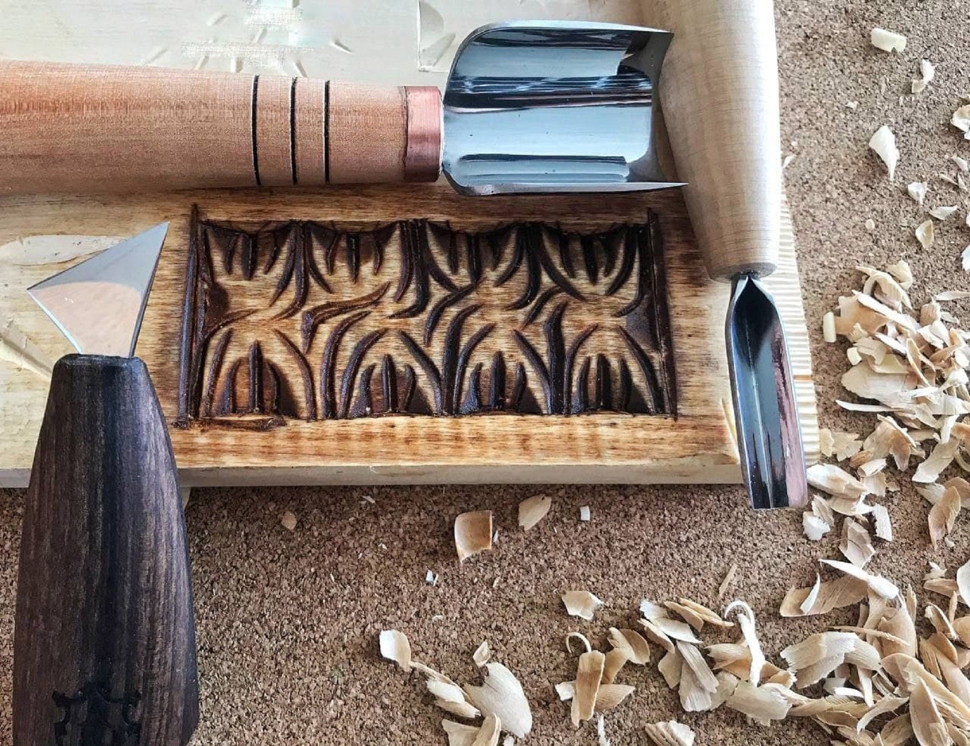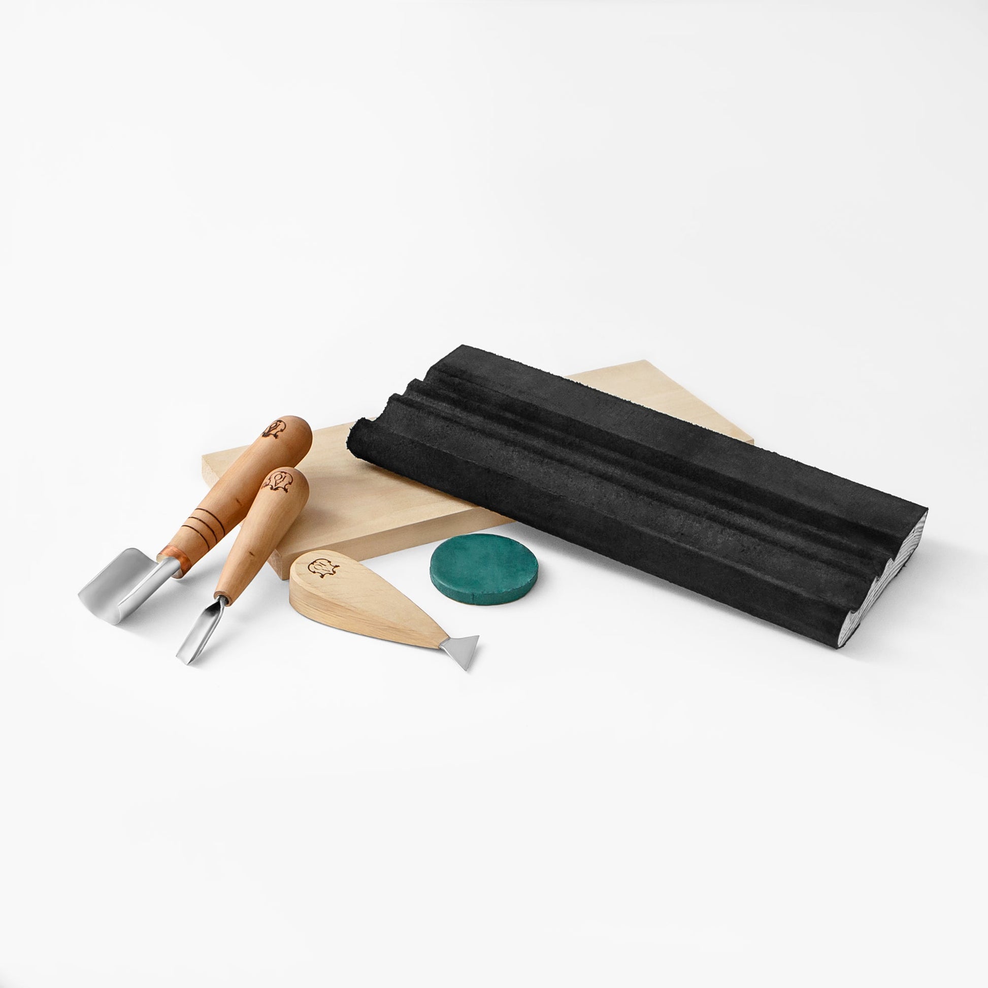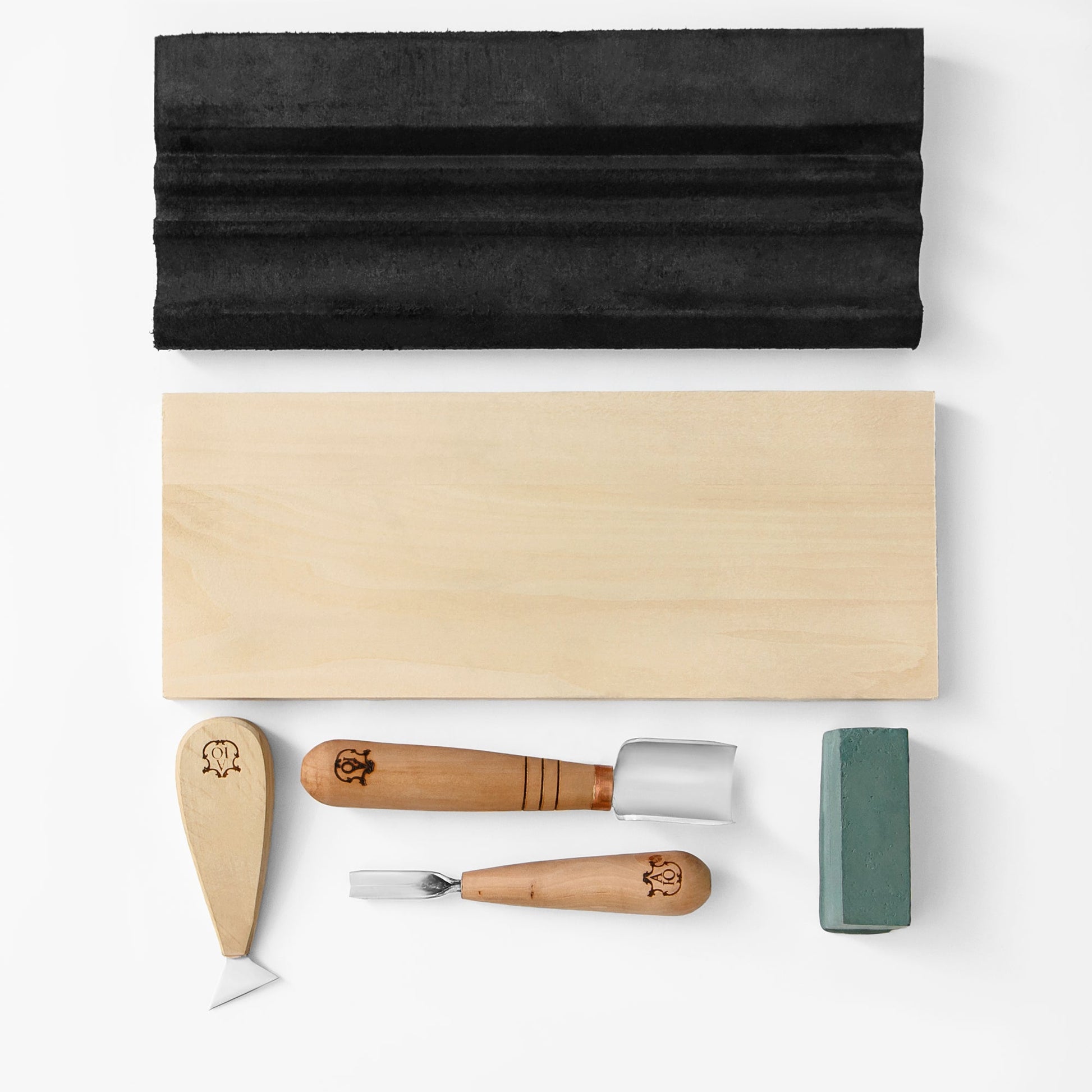 The kit includes all the basic tools needed for geometric carving, a limewood blank, 3 basic tools, and a set for polishing and sharpening.