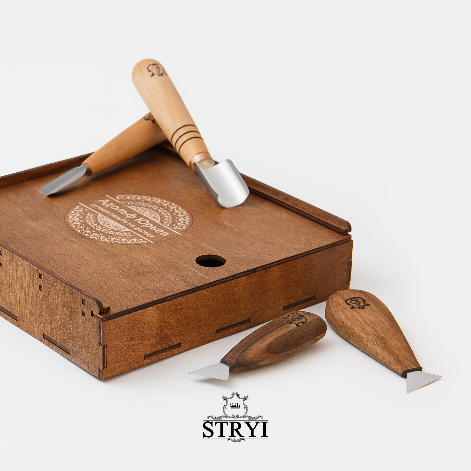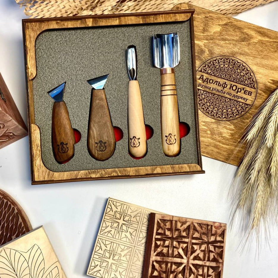 Chip carving kit STRYI 4 pcs set is a basic completed kit, which includes short tools from author line from experienced carver Adolf Yurev (AY) and his unique technique in chip carving for making volumetric carving patterns.
