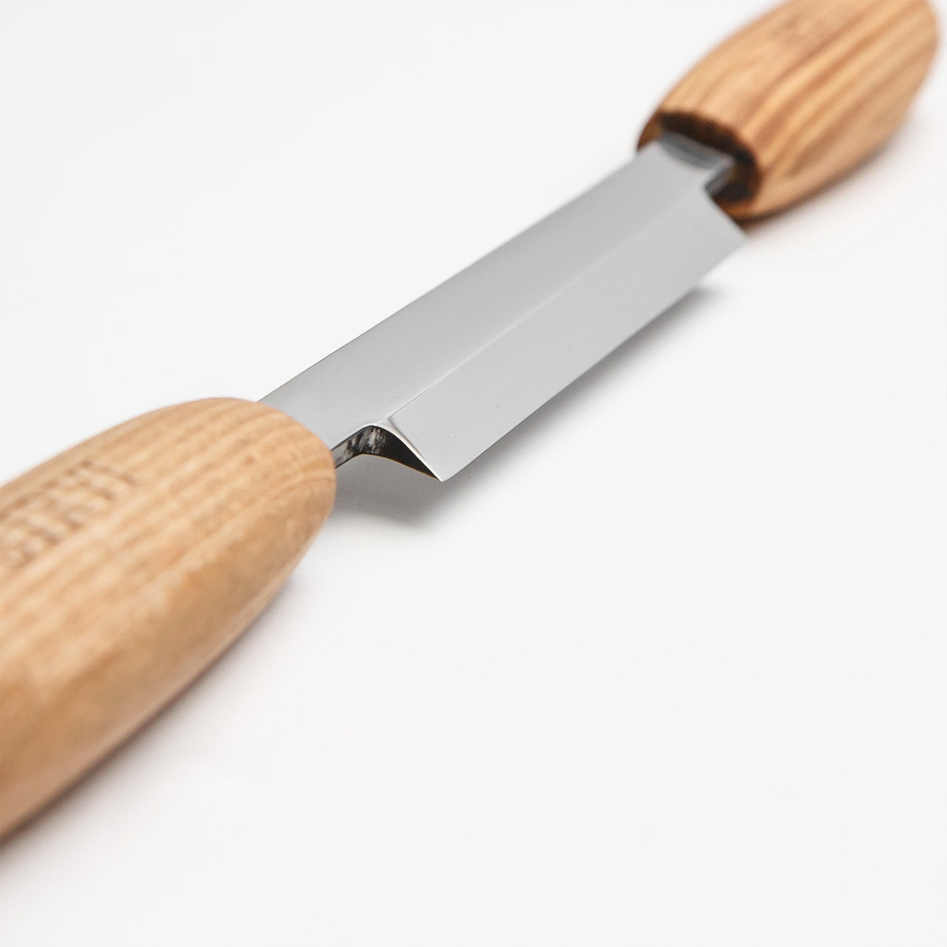 The pushknife with the carbon steel blade that holds an excellent edge. It has a 13 cm splitting knife blade with oak wood handles (lightly oiled to prevent drying and cracking) which provide excellent grip and control when splitting. It will split most types of wood including hardwoods.