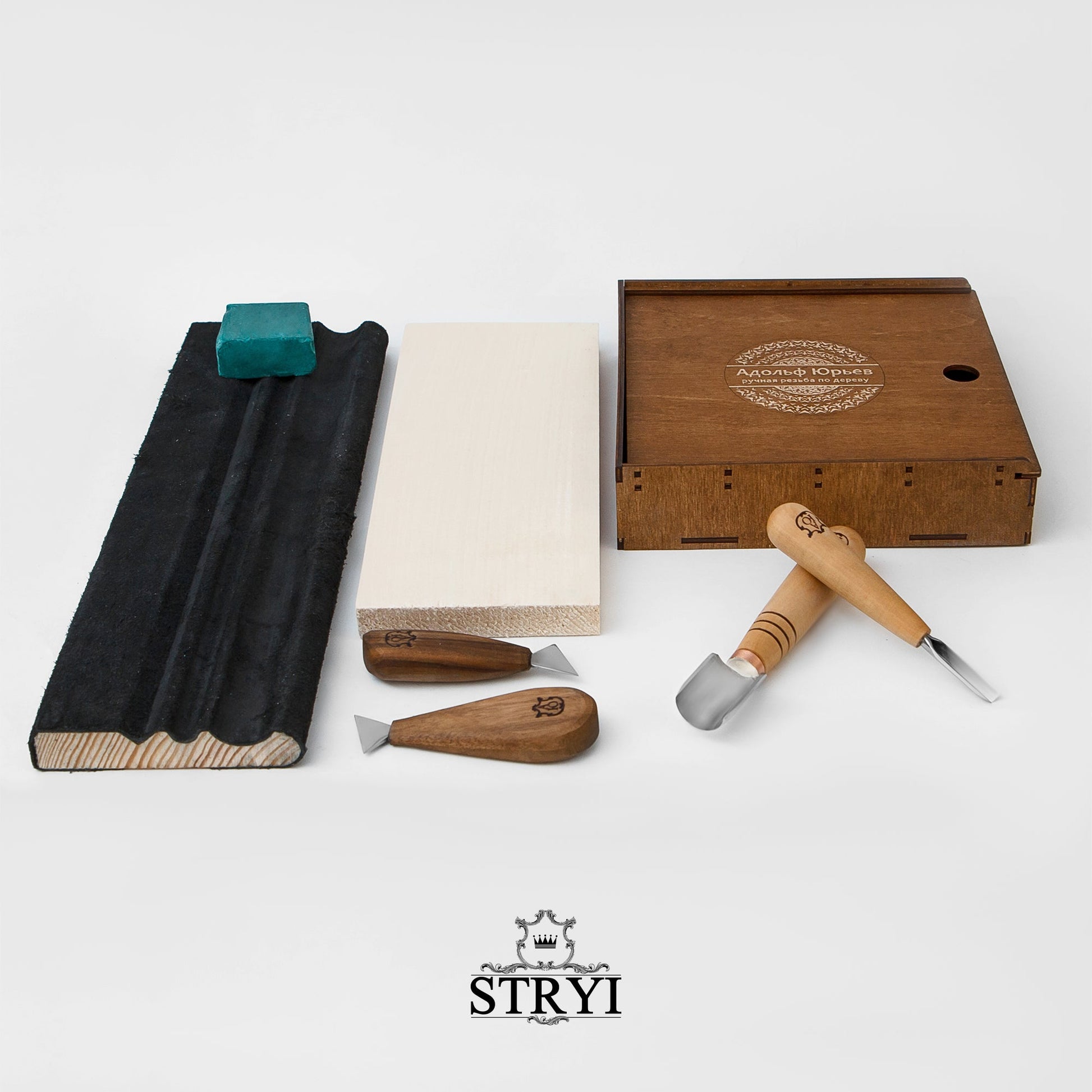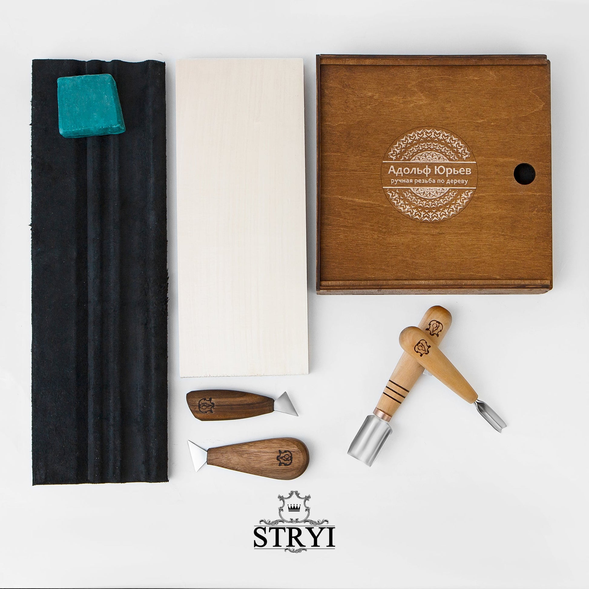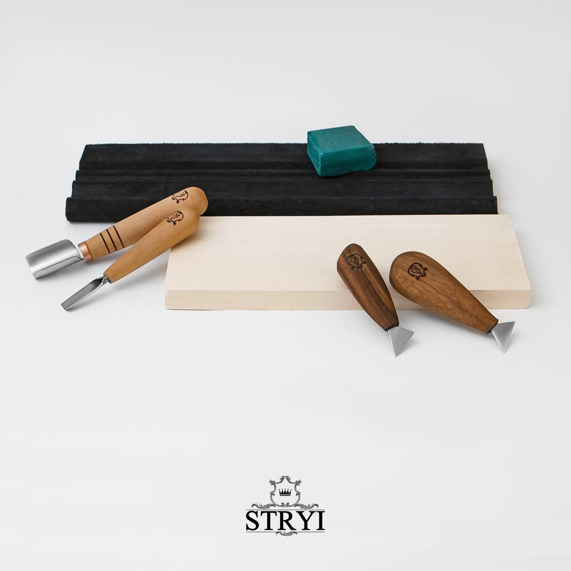 The kit includes all the basic tools needed for geometric carving, 4 tools, and a set for polishing and sharpening chisels.