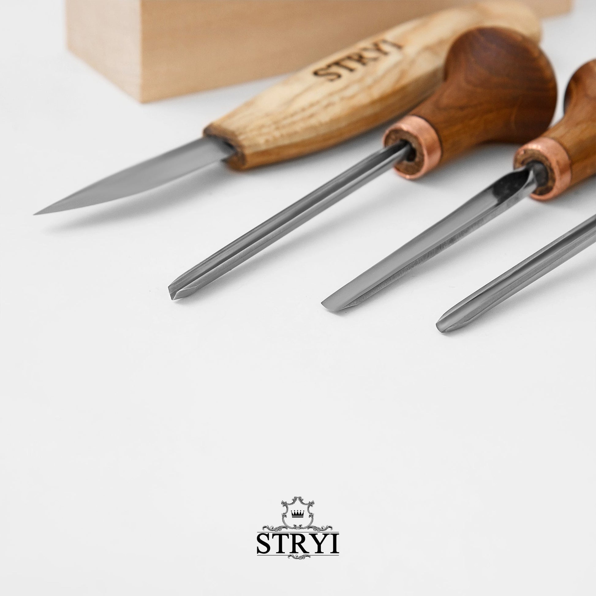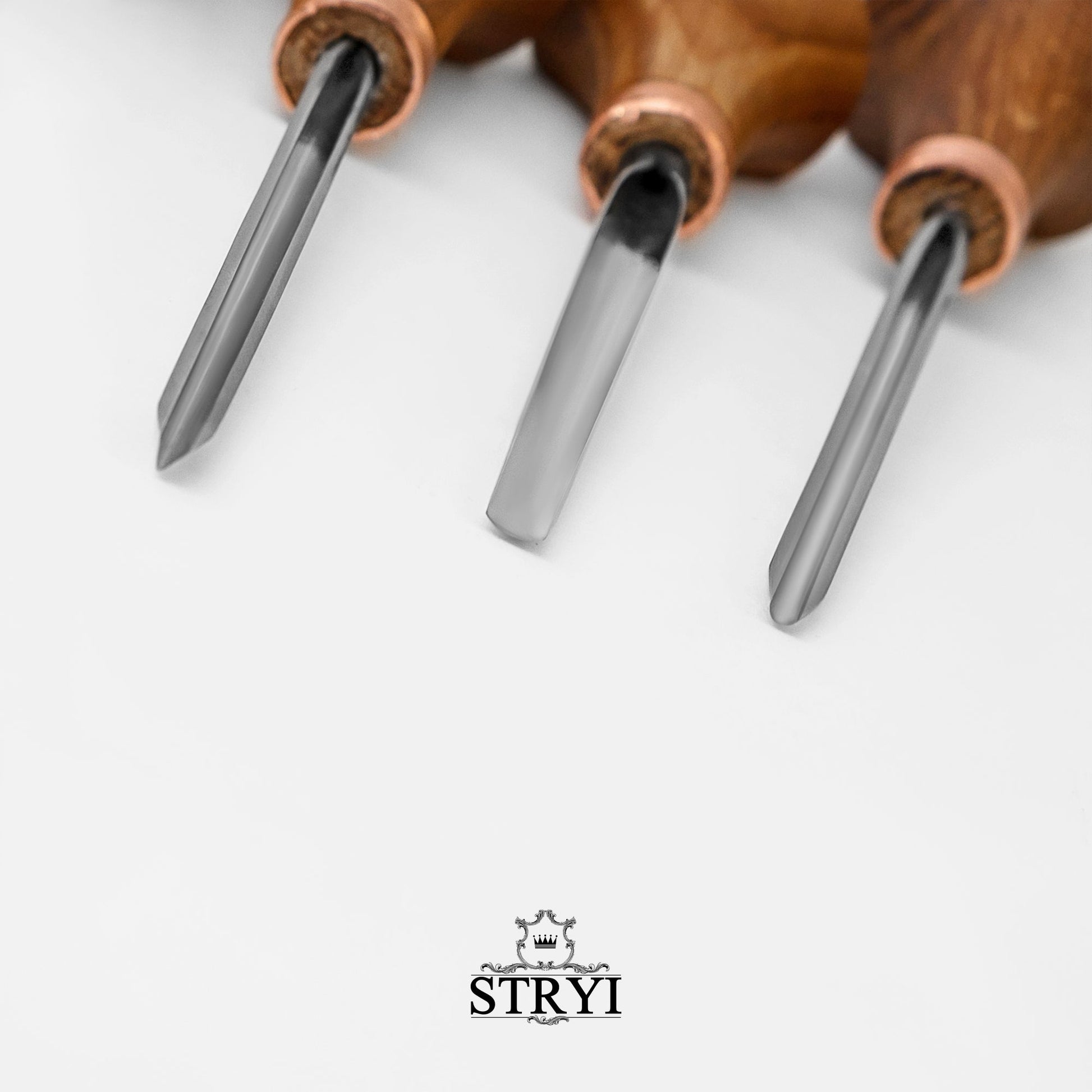 - Palm V-tool (45°, 3mm): Ideal for carving clean lines, grooves, and defining facial features.