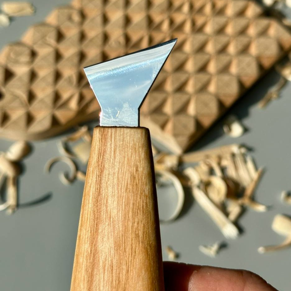 It can be used in triangle chip carving in three cuts, for cutting through lines, and for cleanups in relief carving. The convenient shape of handle for comfort layning into the palm of the carver contributes right control of cutting and right inclination of the blade.