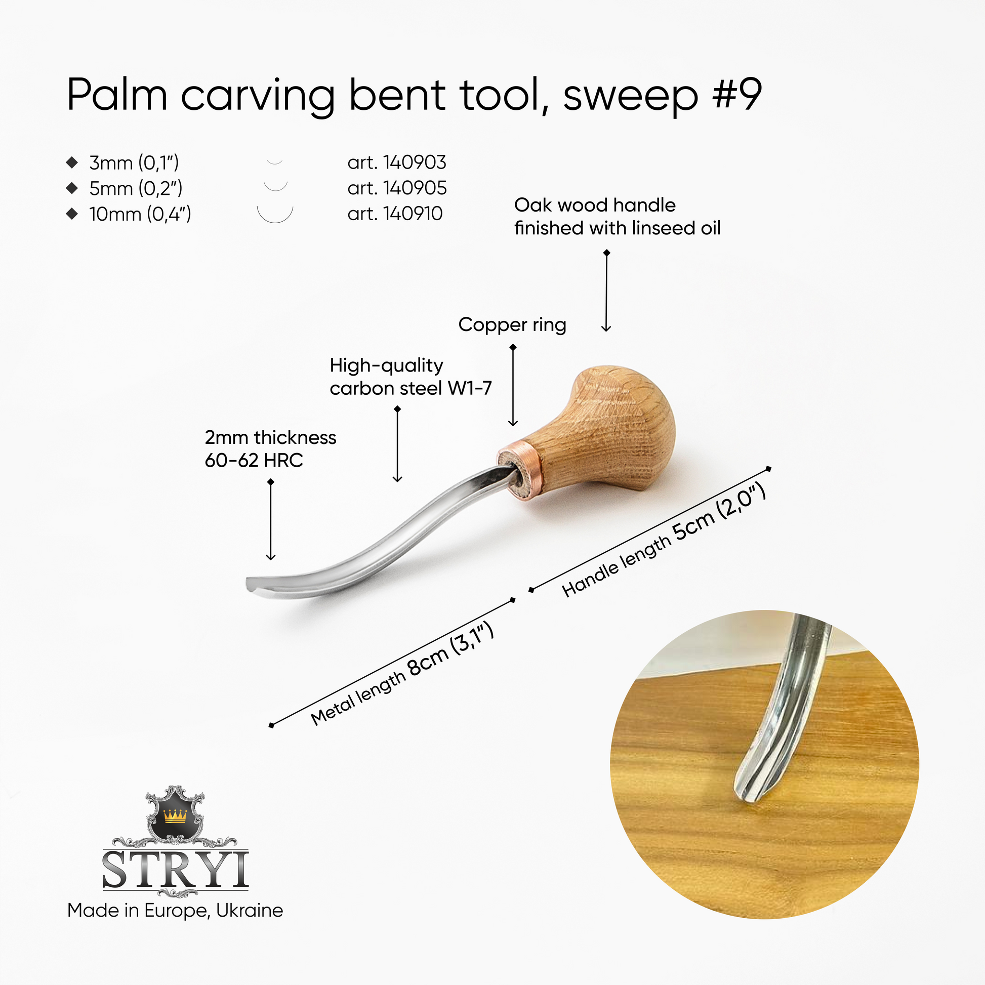 Palm carving bent gouge sweep #9 STRYI Profi , linocutting tool, burins STRYI, palm tool, detailing knife