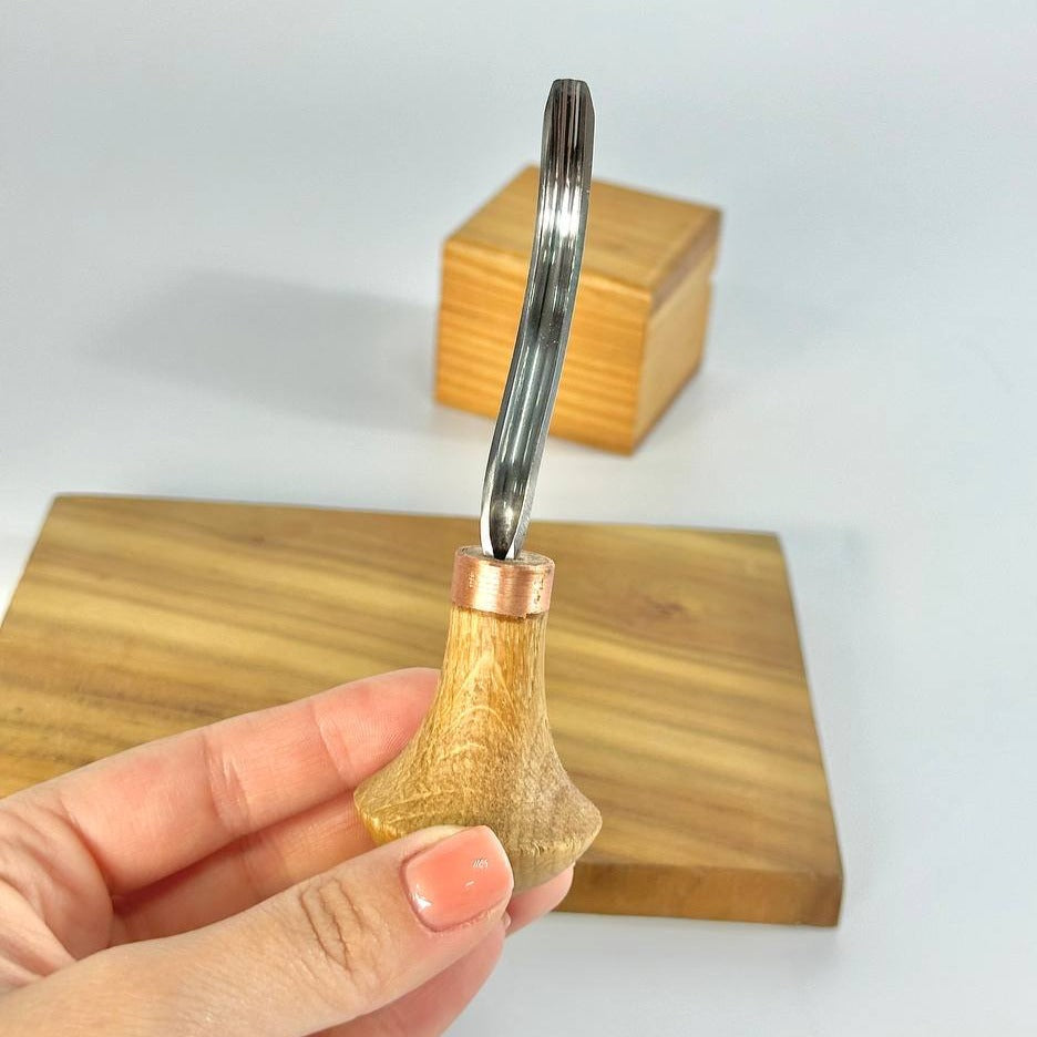 It is ideal for creating deep details and hollows in figurines, this palm bent gouge features a shorter blade and a compact, comfortable handle, making it perfect for your finest wood carving projects. Whether engraving or working on micro relief carvings, this tool ensures precision and ease. A great gift for woodcarvers or a special dad interested in woodworking, it's forged from durable steel for lasting quality.