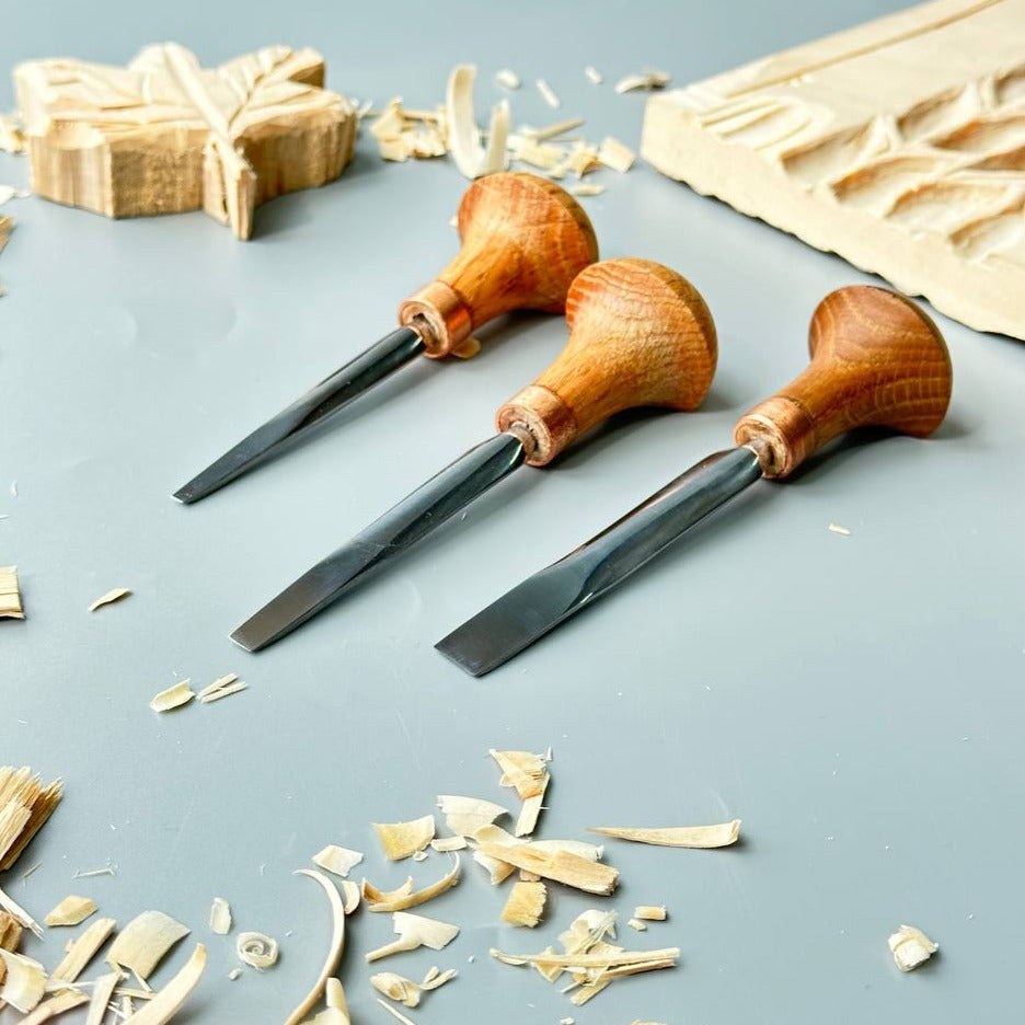 Palm tools feature a small handle that's wider at the top to nestle in the palm of the hand. These tools are designed to be pushed with the hand and not tapped with a mallet. They're used mostly for detail work in woodworking, gypsycarving and linocutting.