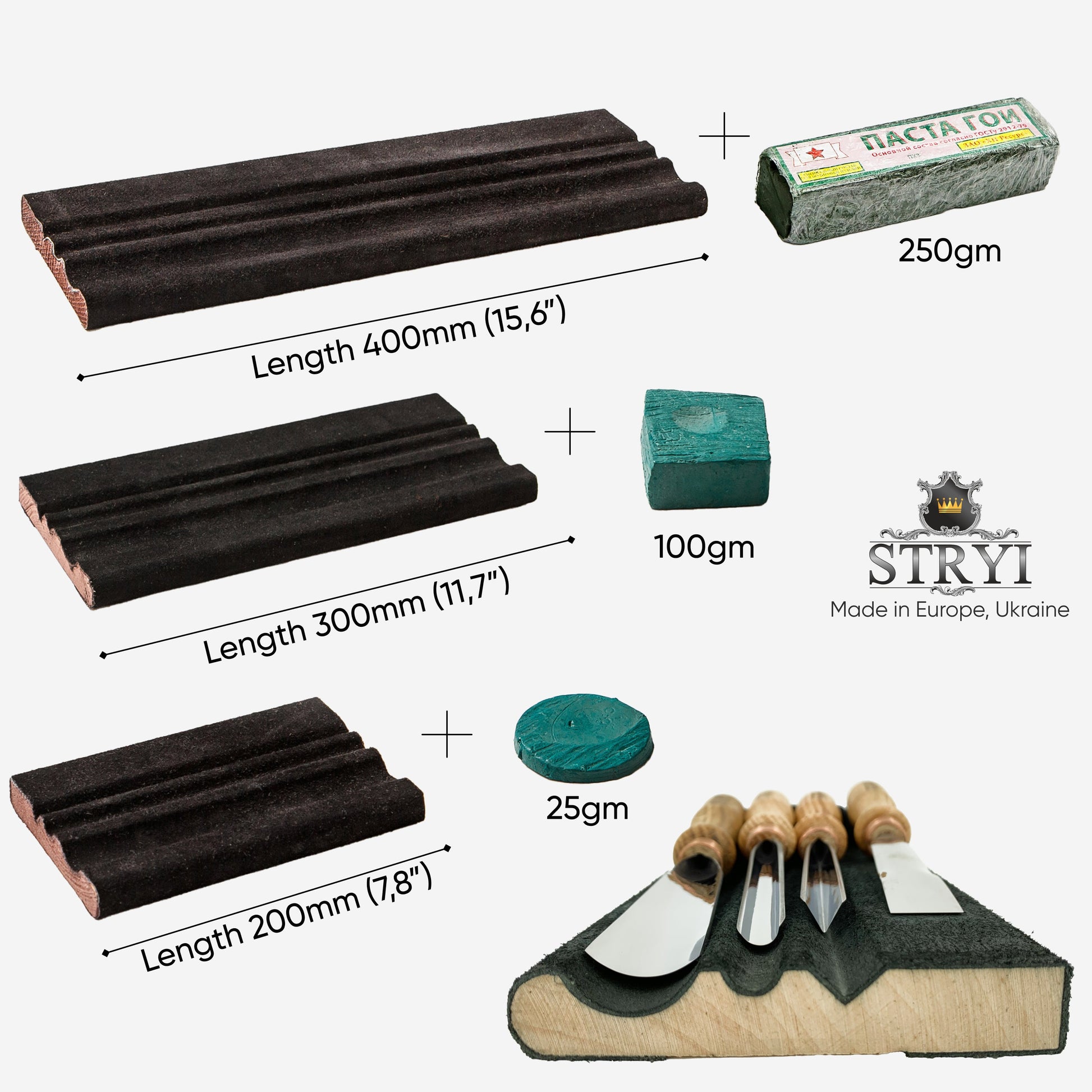The profile leather scrop has various bends for flat chisels, V-tools, semicircular gouges and gouges of other profiles, knives also.