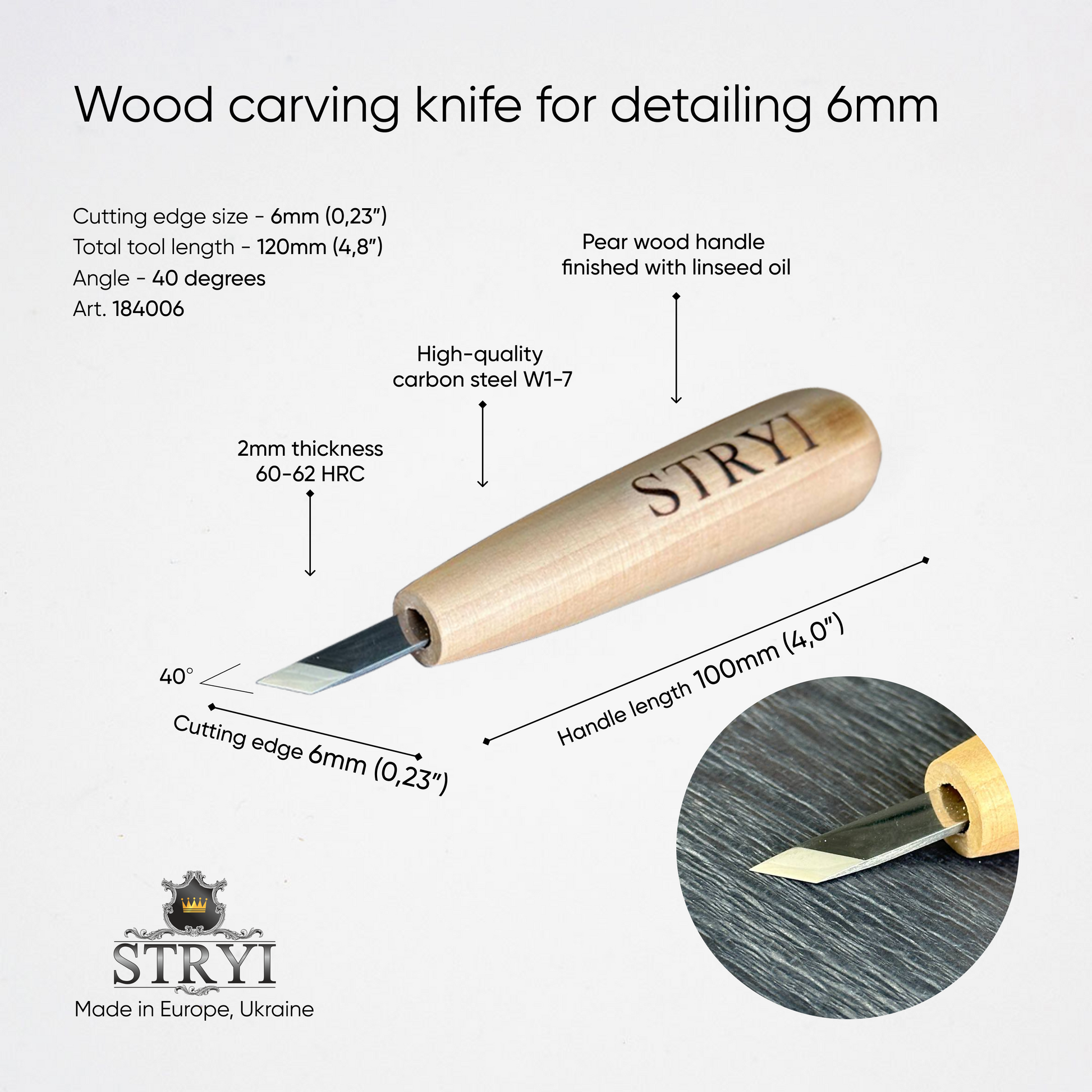 Short skewed knife for detailing STRYI, art. 184006 is purposed for cleaning up different patterns in relief carving, chip carving, whittling figures and jewelry accurate with this tool.