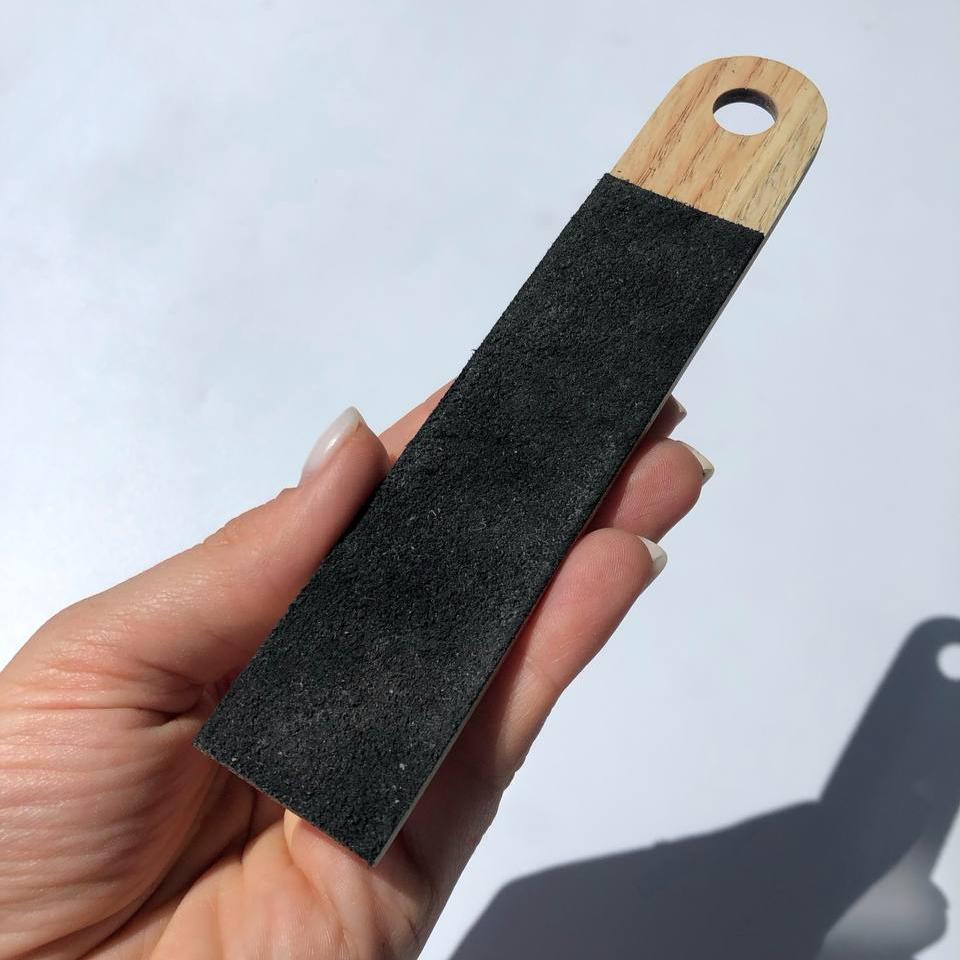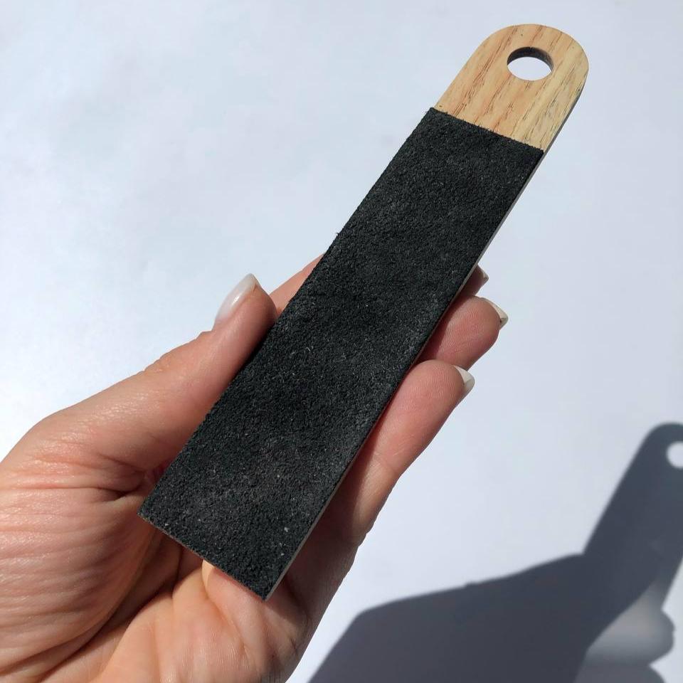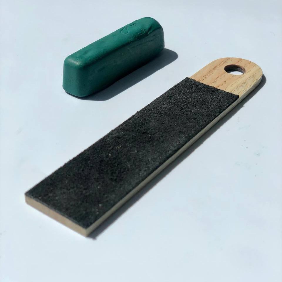 - The leather on the profile strop is coated with polishing paste for effective sharpening.