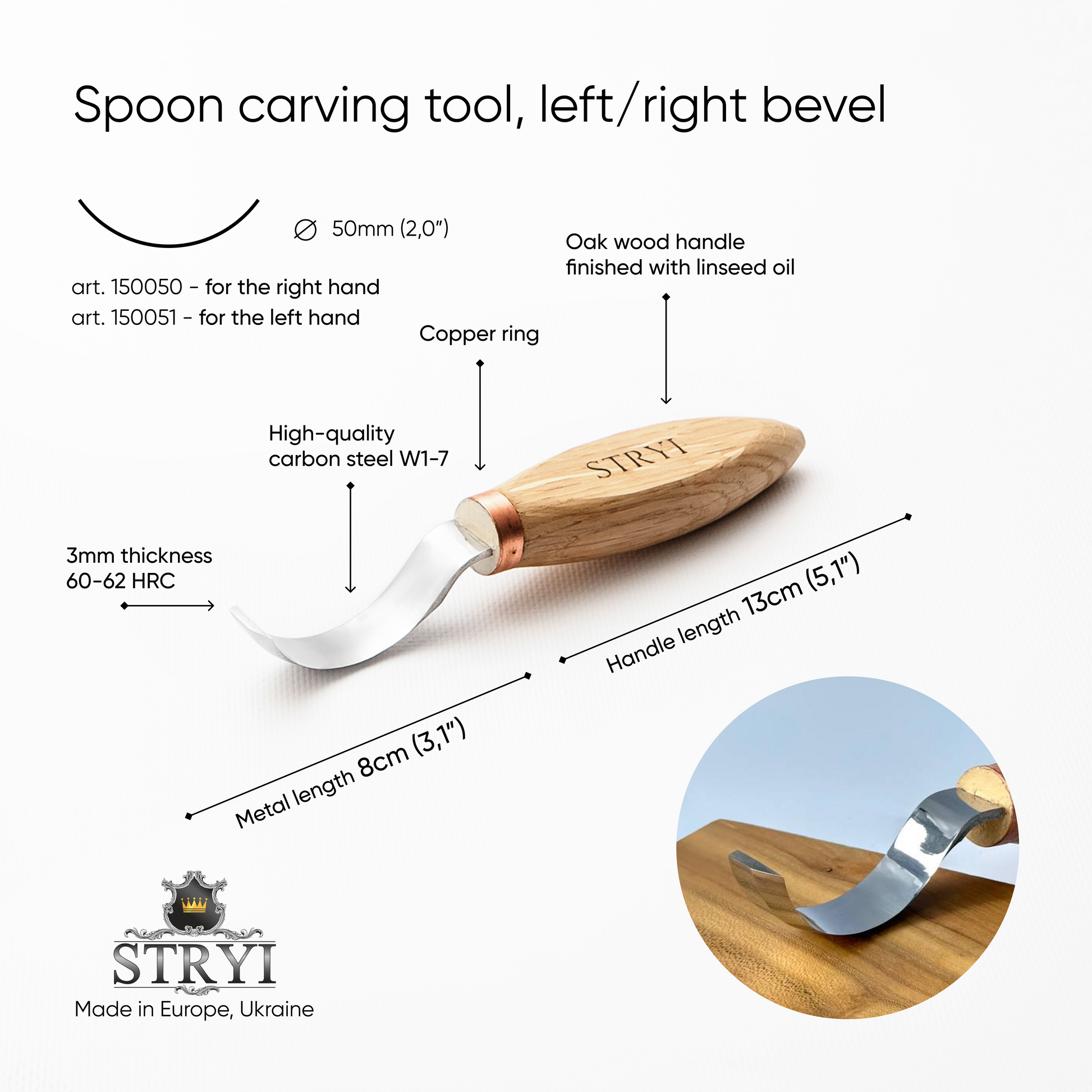Spoon Bowl Kuksa carving hook knife 50mm STRYI Profi, art. 150050 (right-handed) and art. 150051(left-handed) is designed for making sloping deepness in spoons, spatulas, and ladles.