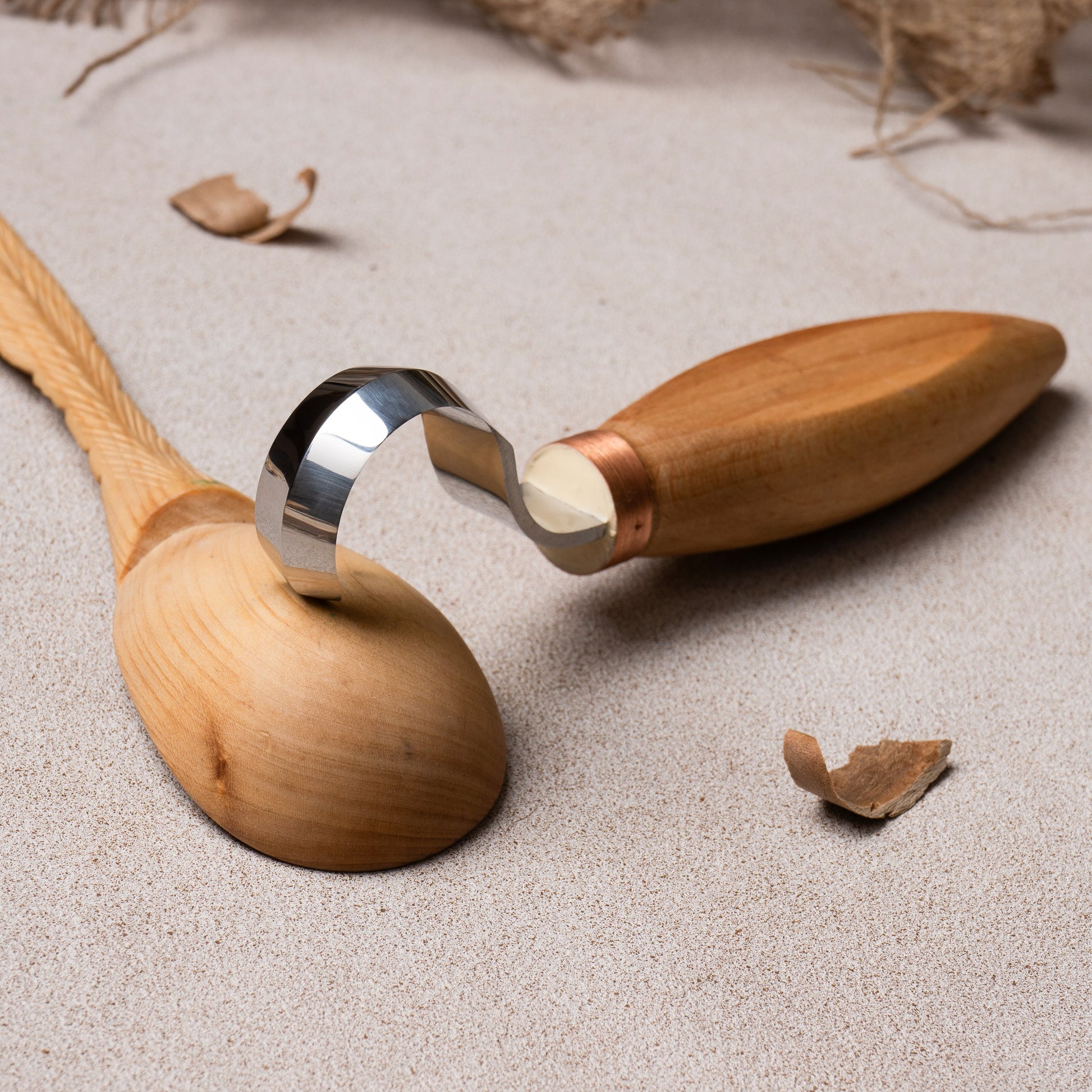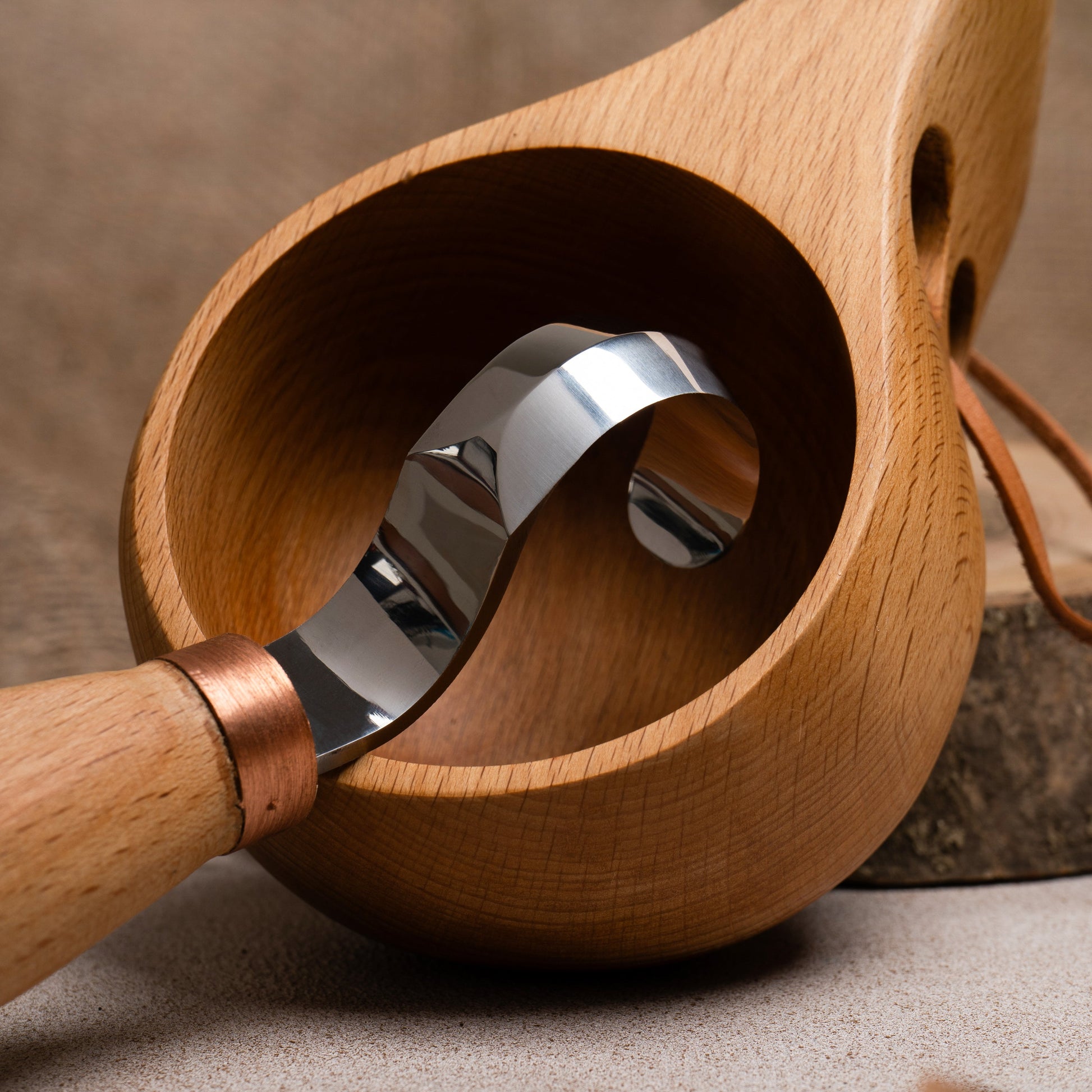 The spoon knife's cutting edge is meticulously sharpened, ensuring clean and precise cuts. Three sharpened sides and double-bladed ones allow for better cutting and maneuverability, making it ideal for intricate carving tasks, such as making deepness in few steps for bowls, spoons, pots and other wooden objects.