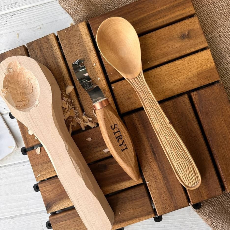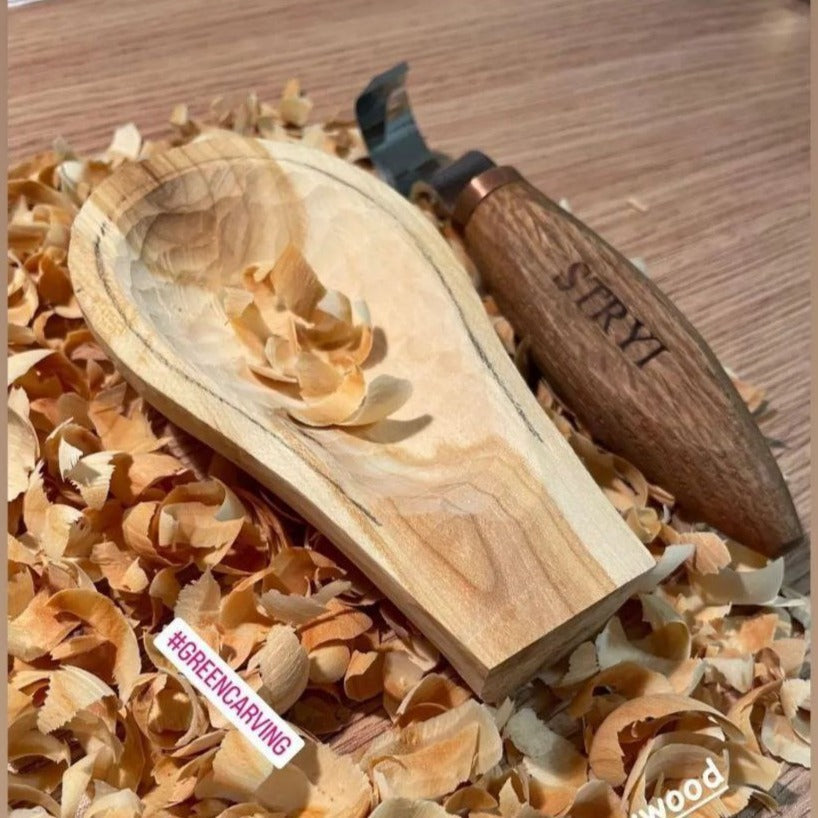 The spoon knife STRYI Profi double-sided (art.150035) with 3 sharpened sides is a versatile tool designed for spoon making, and carving deep hollows.