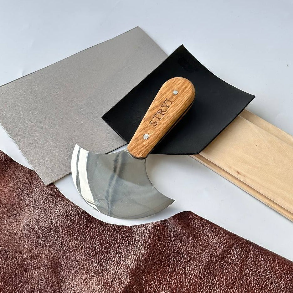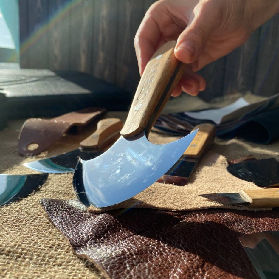 The half-moon (or round) knife is a classic and versatile leatherworking tool known for its ability to handle both straight and curved cuts.