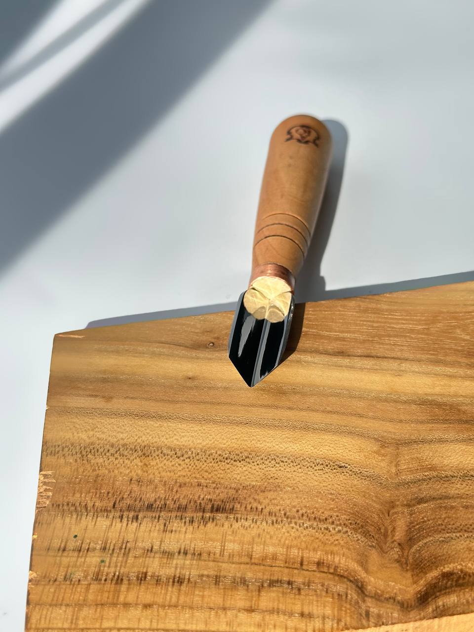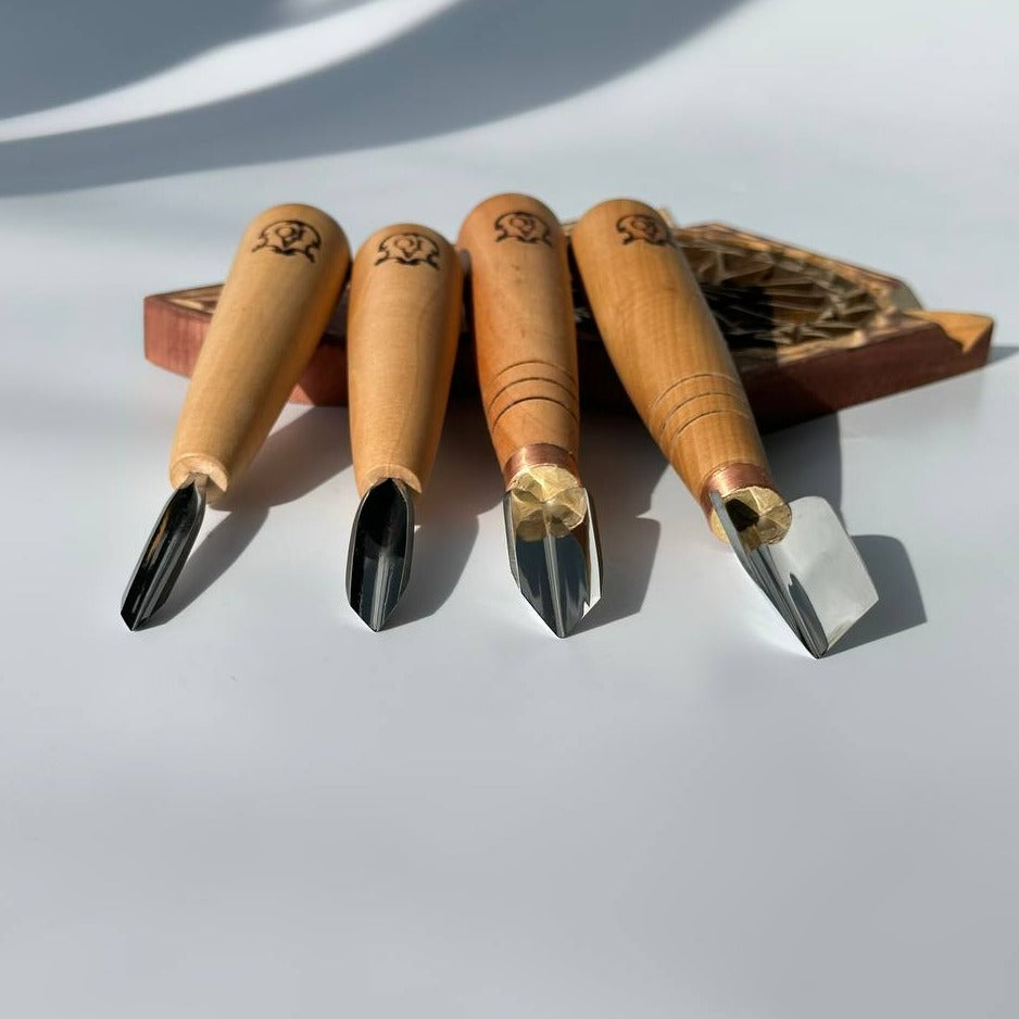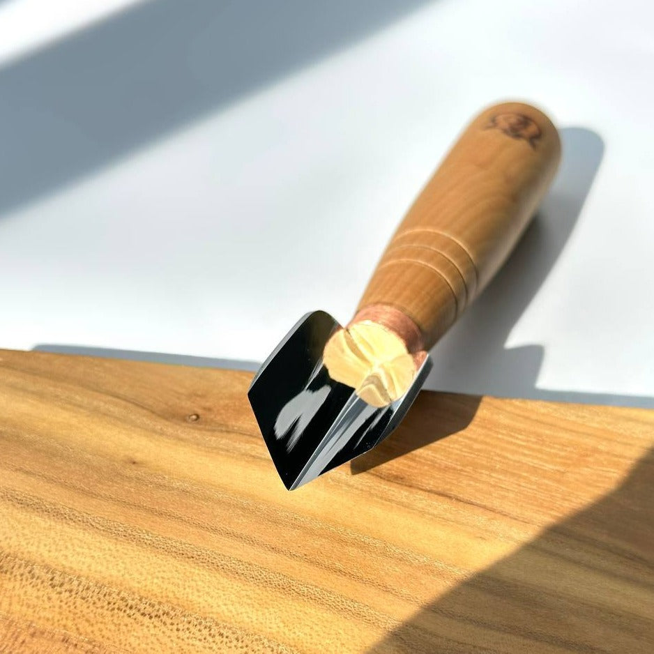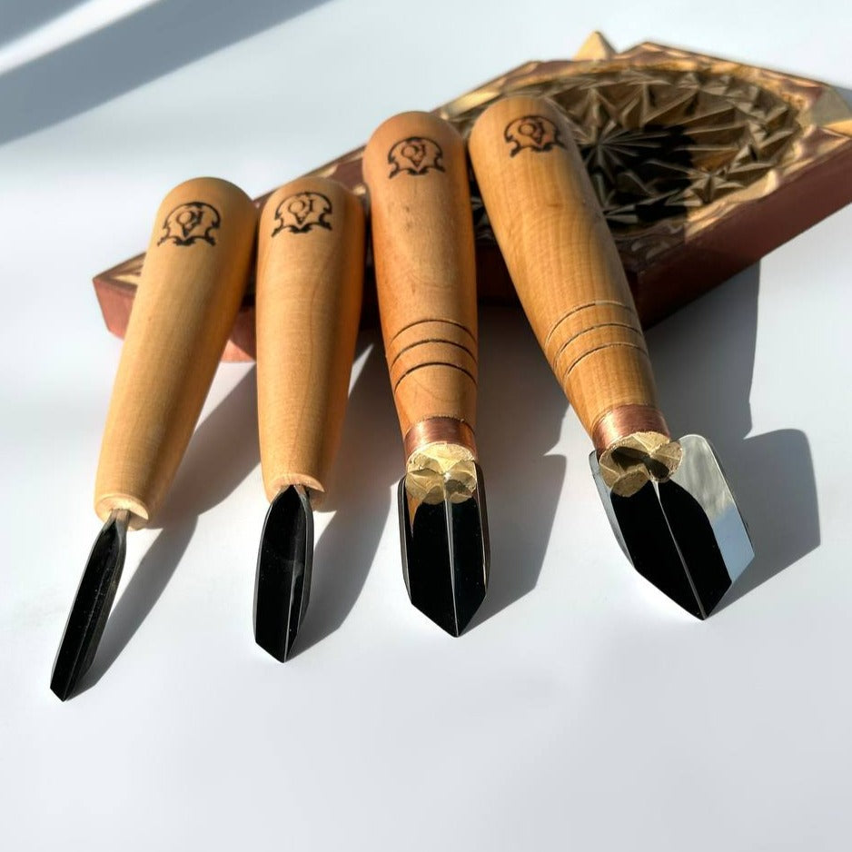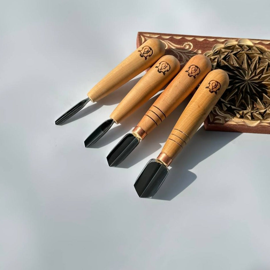 Their sharp skew-bevel V-shaped cutting edge, meticulously honed to perfection is designed to make hair elements, ditches on faces, and body parts, and patterns in volumetric chip carving and relief carving.