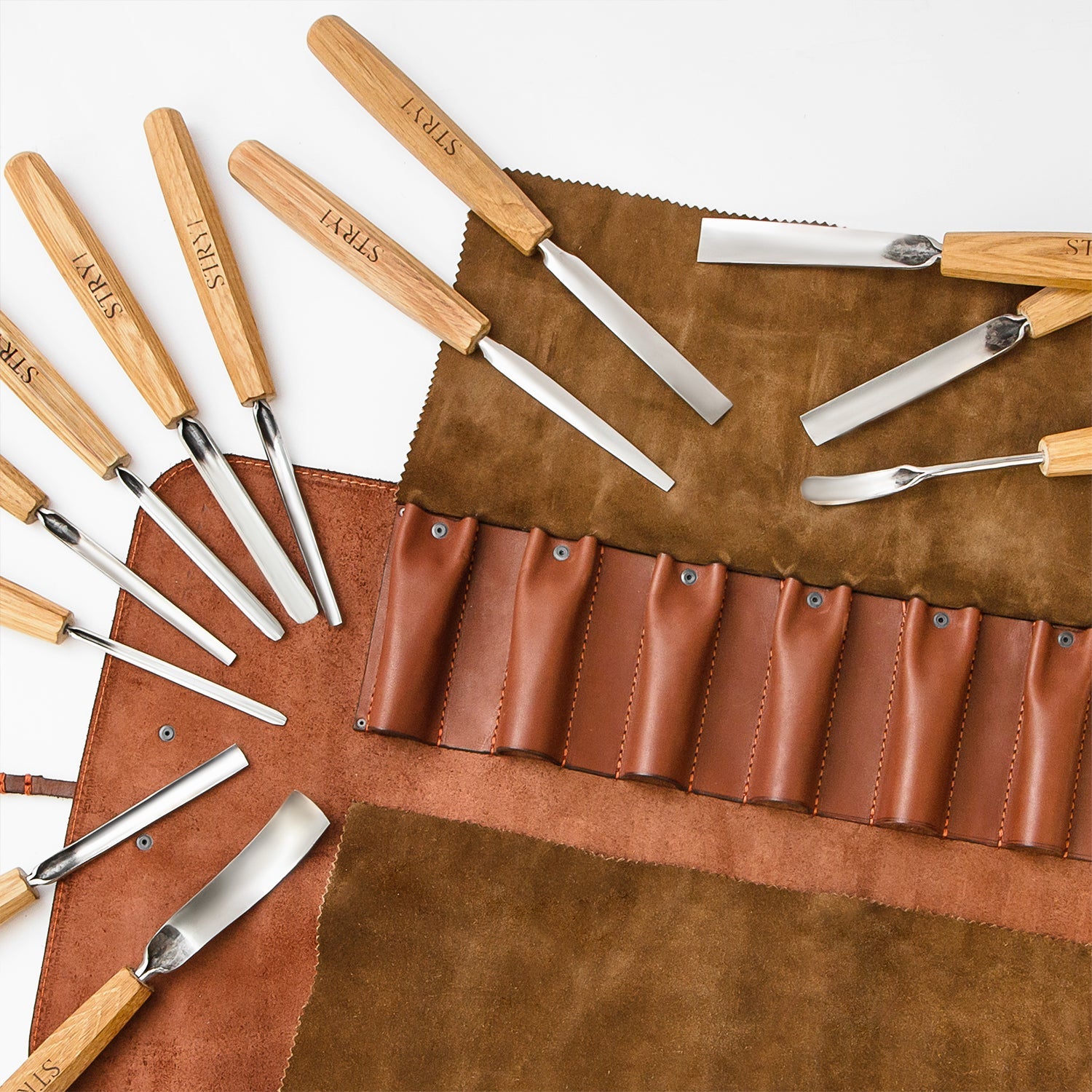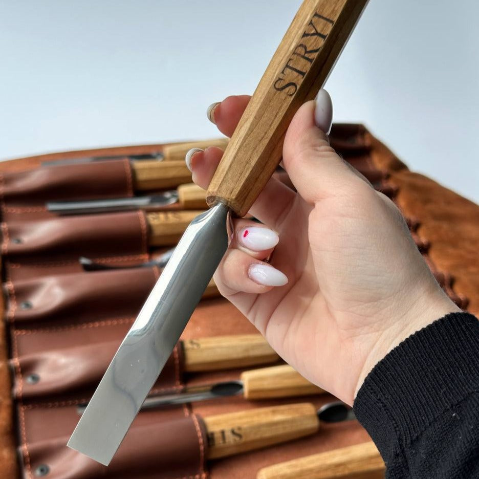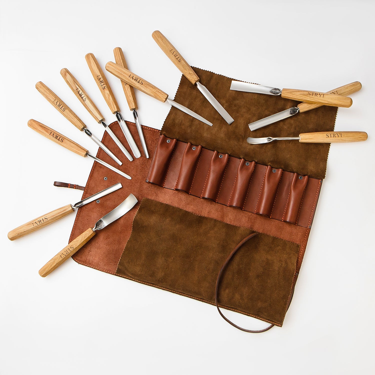 The Set is provided in a genuine leather case. The leather roll case is handmade from genuine leather, and its design allows for the compact placement of tools. The blades are positioned in such a way that they do not touch each other, preventing damage. Every chisel is passed through the technical control department before it is shipped.