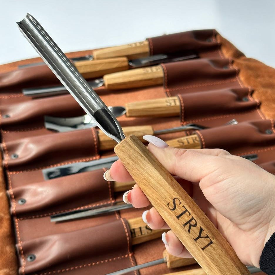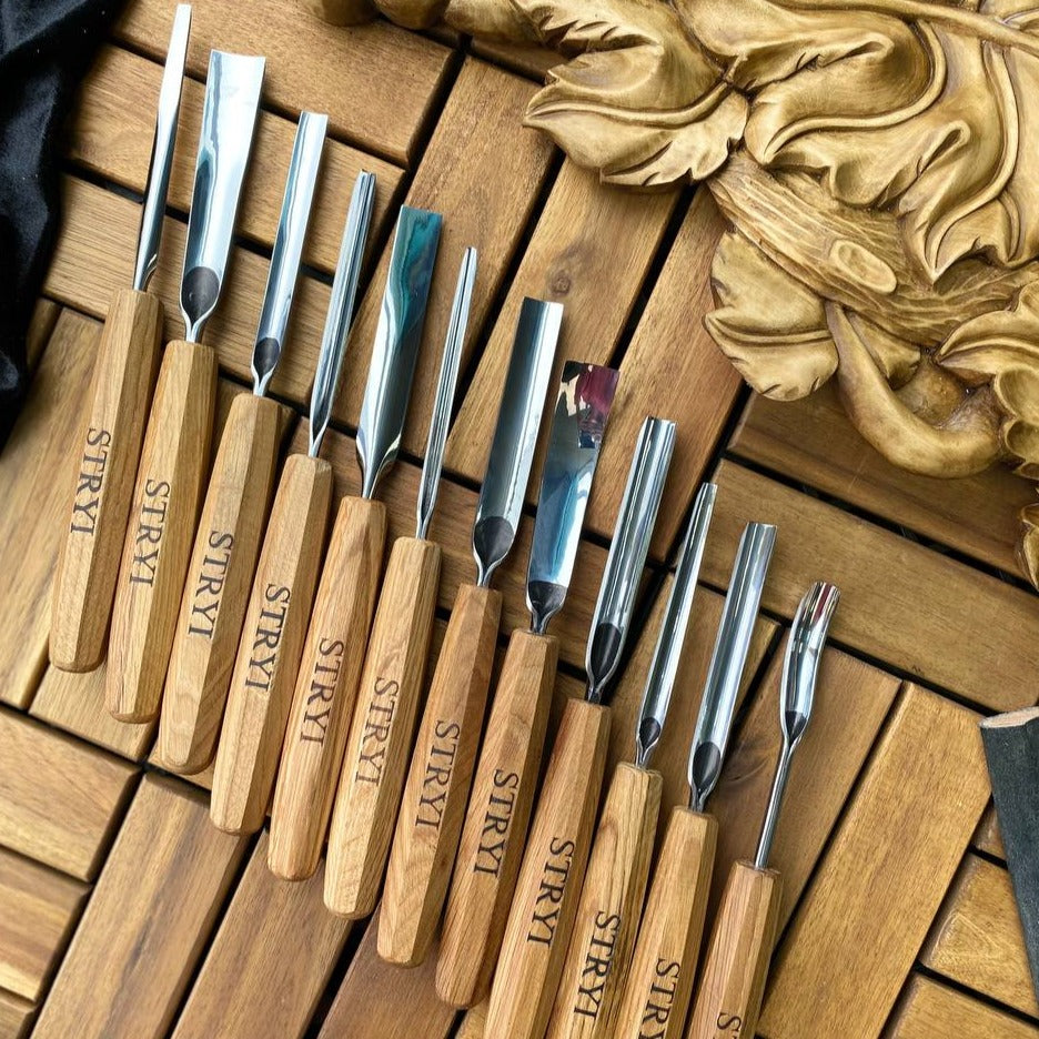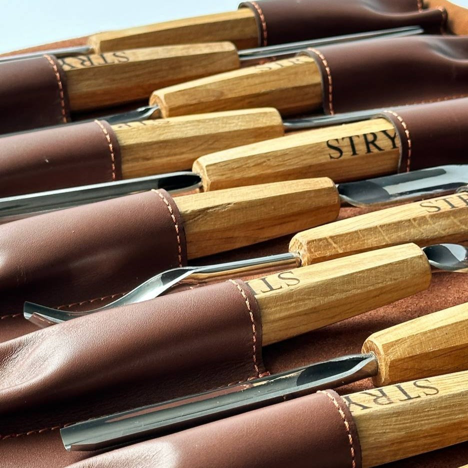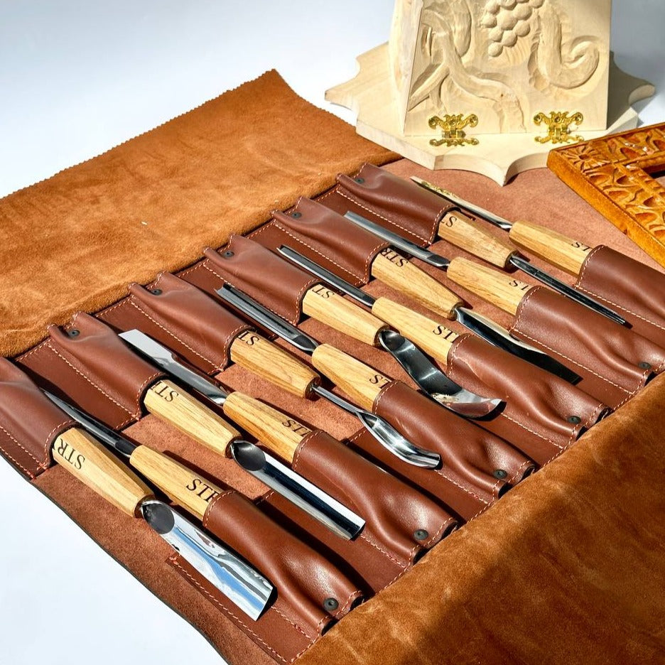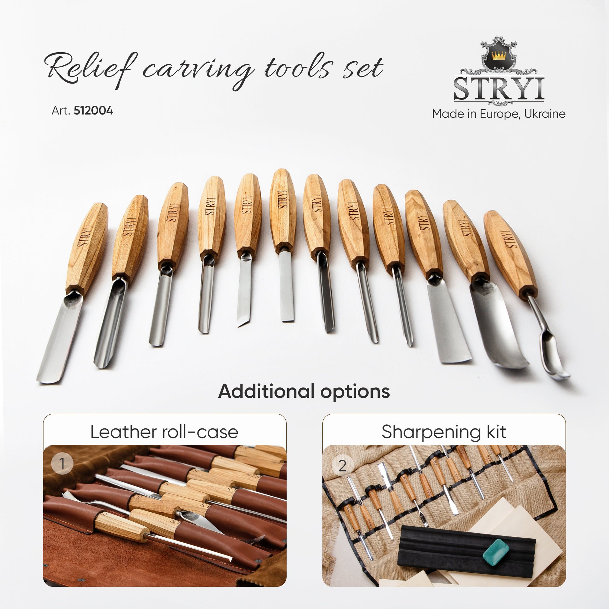 Wood carving kit for relief carving in leather case, 12pcs STRYI Profi, Chisels set, Gouges set, Gift ready