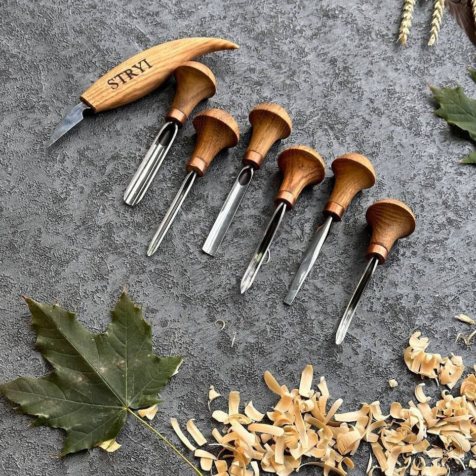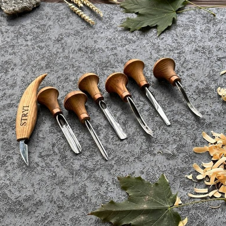 Wood carving tools set of 7 pcs, gravers and burins STRYI Start, linocutting set, detailed carving, microcarving