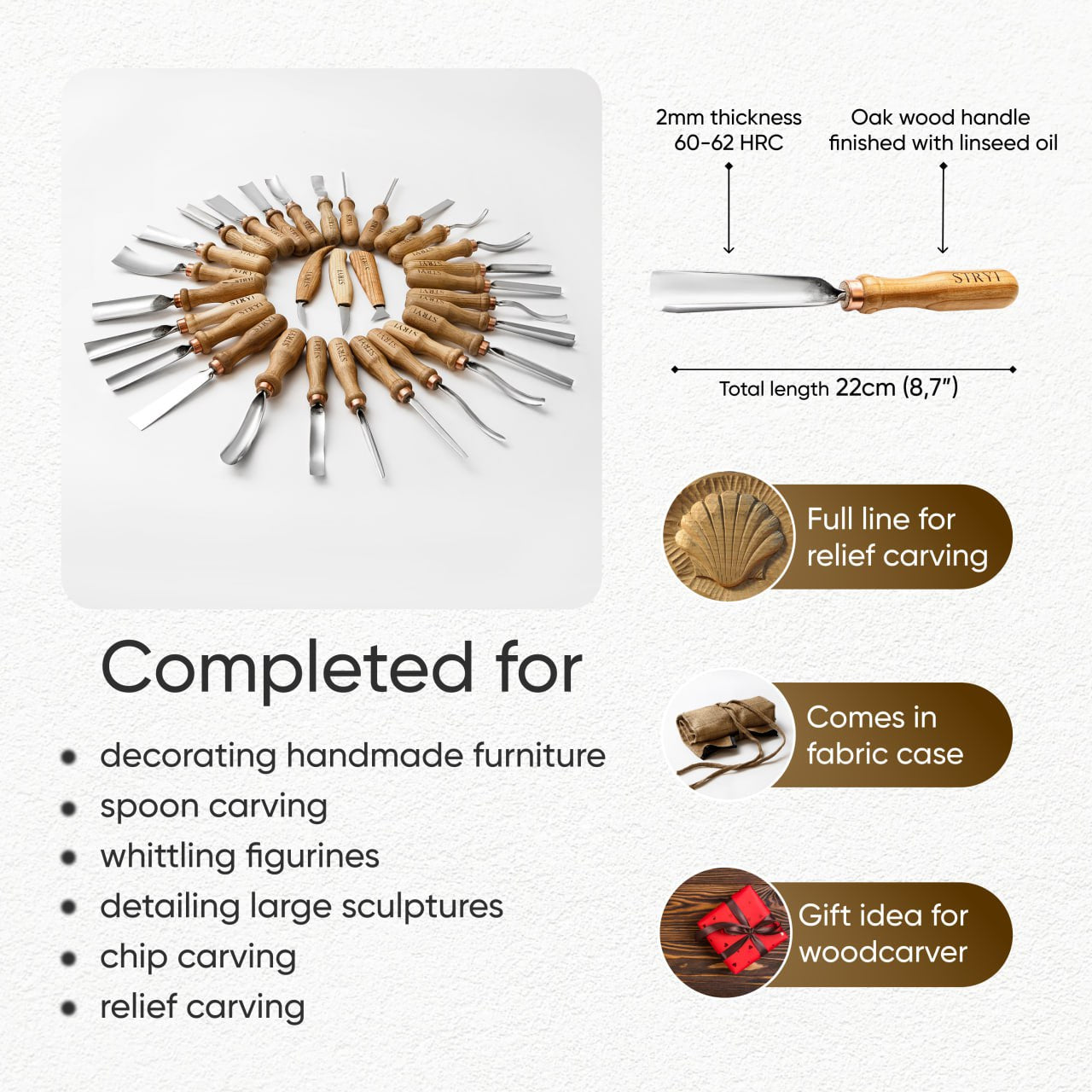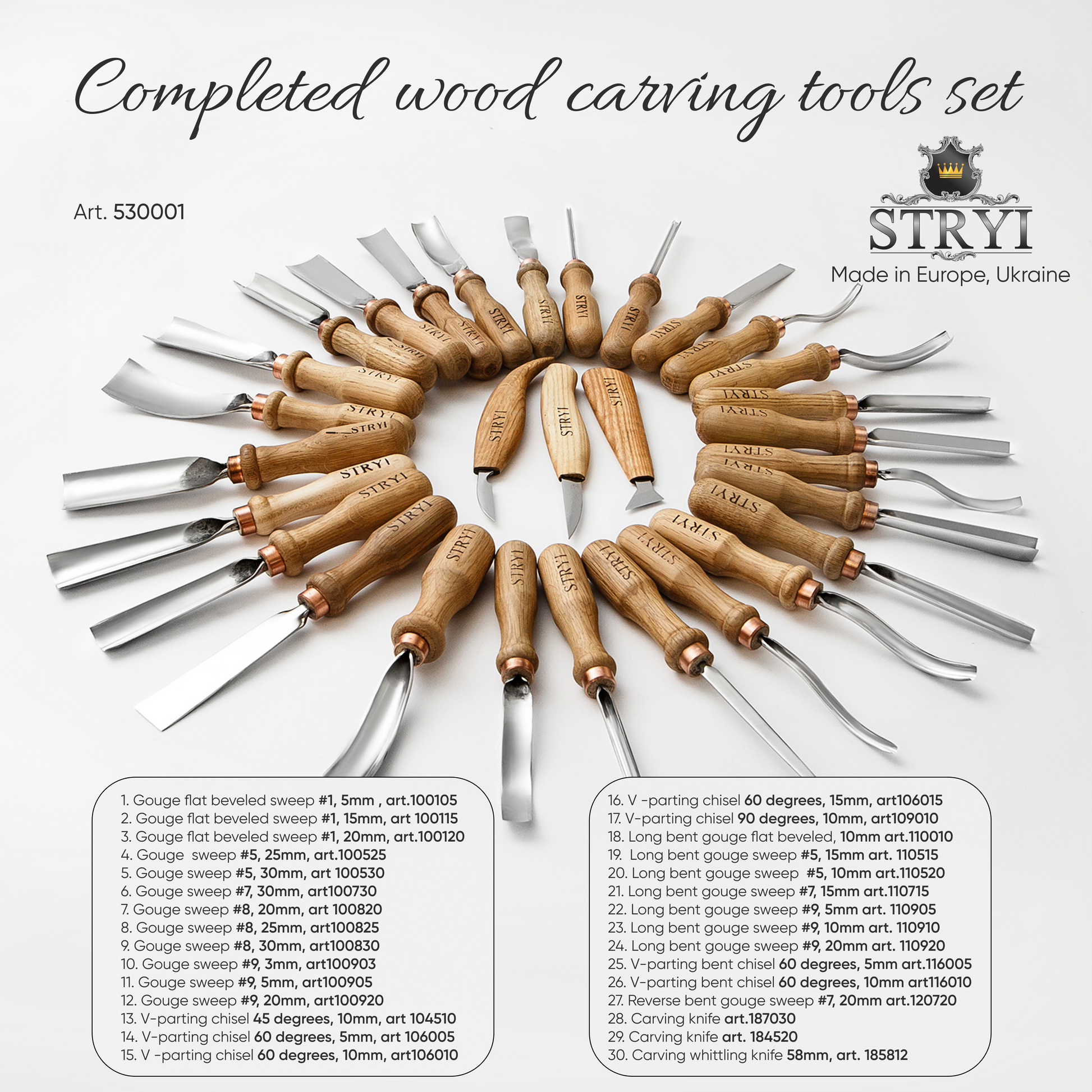 The Professional Wood Carving Tools Set of 30 pcs STRYI Profi is a comprehensive collection of 30 high-quality instruments, perfect for both beginners and seasoned professionals.